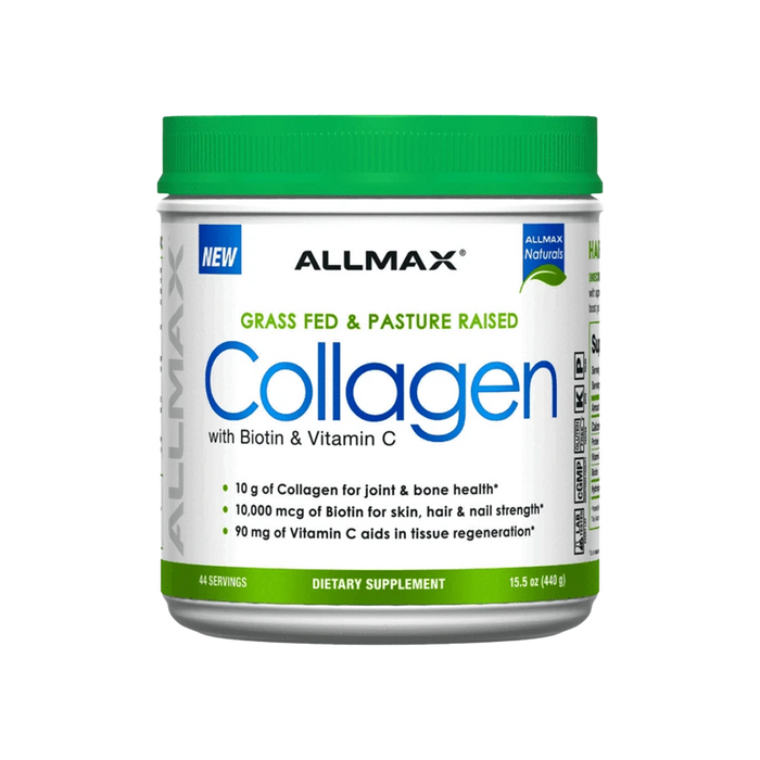 The ALLMAX Naturals line introduces all-new sourced from Grass Fed and Pasture Raised cows, Collagen Powder with added Biotin and Vitamin C. Our Collagen Protein is derived from Hydrolyzed Collagen Protein Peptides, giving you 9 g of protein in every scoop. Collagen is essential for production of connective tissue and provides support for healthy joints, hair, nails and skin. What makes ALLMAX Naturals Collagen so special? Our triple-action formula not only contains Collagen but the added benefits of Vitamin C that aids in the synthesis of Collagen along with Biotin for extra support in the formation of healthy hair, nails and skin.