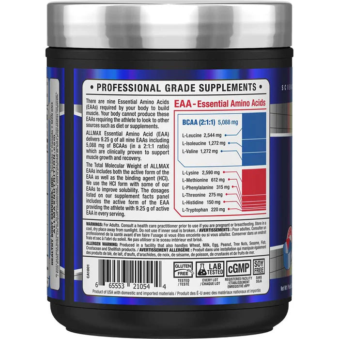 Allmax EAA deliver 9.25g of all nine EAA including 5,088mg of Branch Chain Amino Acids (BCAA) in a 2:1:1 ratio which are clinically proven to support muscle growth and recovery.